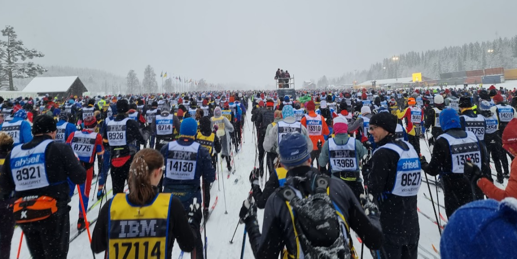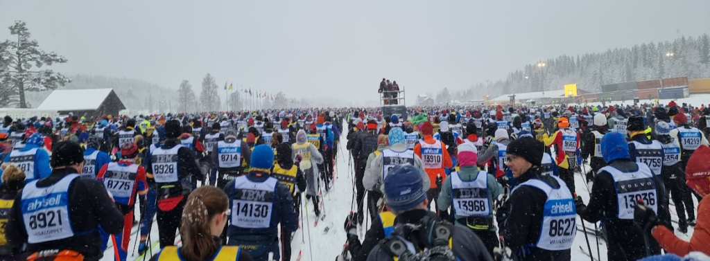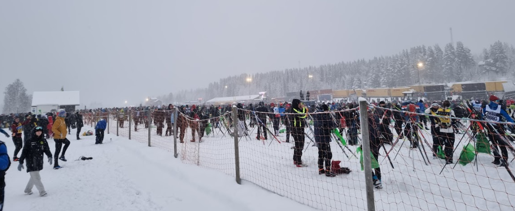 Vi vaknade ca kl 05 och såg att det kommit ca 2-3 decimeter nysnö och att snön fortsatte vräka ner. Dagen innan hade vi fått en förvarning om det på väderprognosen men jag hade inte trott att det skulle komma så mycket snö. Vi åt lite frukost och grävde fram bilen- sen fick vi skjuts ner mot starten från Lindvallen. Vi började med att åka runt på östra sidan om älven men efter att ha suttit i kö mellan 06 och 06.30 utan att något hänt så vände vi och åkte vanliga vägen istället. Det var smart men trots det gick vi sista 500 metrarna till backen och åkte sen skidor mot starten för att hinna. Vi var framme ca 7.30, det var ingen kö till startfållan då (men massor av kö till startfålla 10). Vi la skidorna, gjorde ett toabesök och sen var det väldigt svårt att hitta tillbaka till skidorna igen som nästan var översnöade. Precis innan starten gick hade vi allt i ordning och vi kunde ge oss ut på äventyret!
